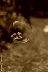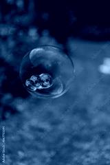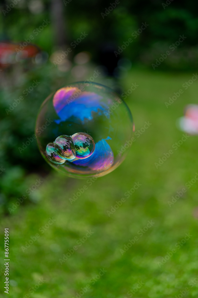 Big colorful blue soap bubble on green background in the garden blown and made by kids
