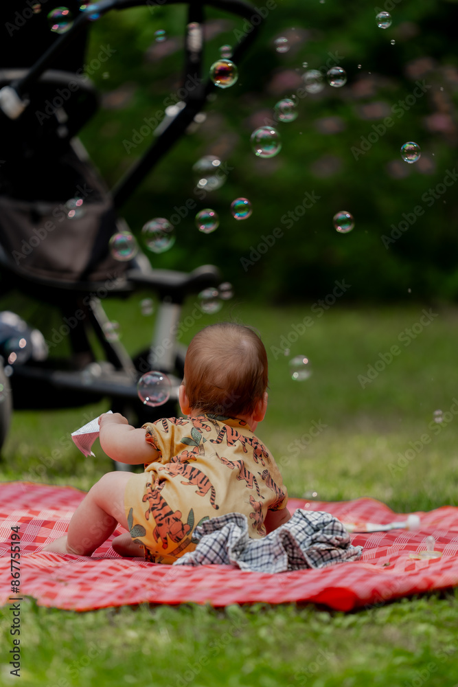Small toddler boy playing with soap bubbles while wearing colorful onesie