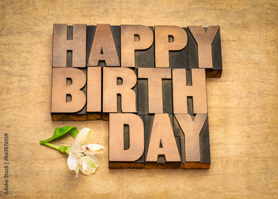 Happy Birthday greeting card in vintage letterpress wood type against handmade bark paper