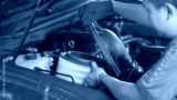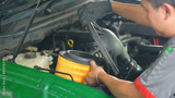 A man is working on a car engine, replacing the air filter
