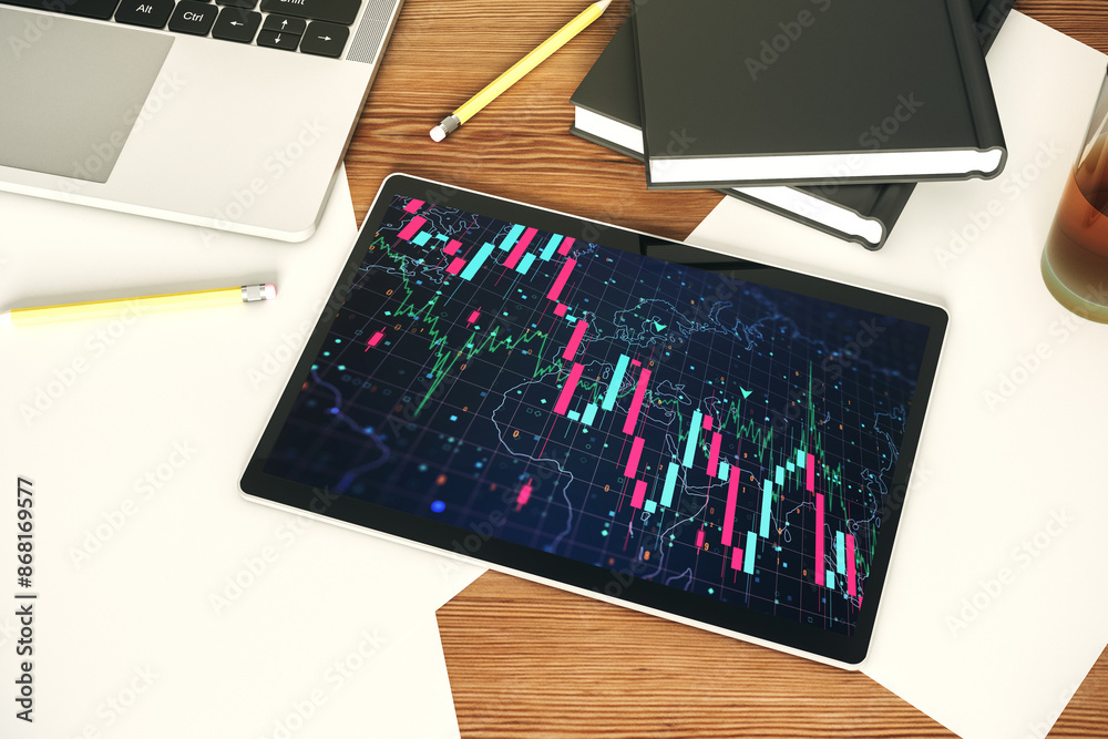 Top view of modern digital tablet monitor with creative abstract global crisis chart and world map hologram. Financial crisis and recession concept. 3D Rendering