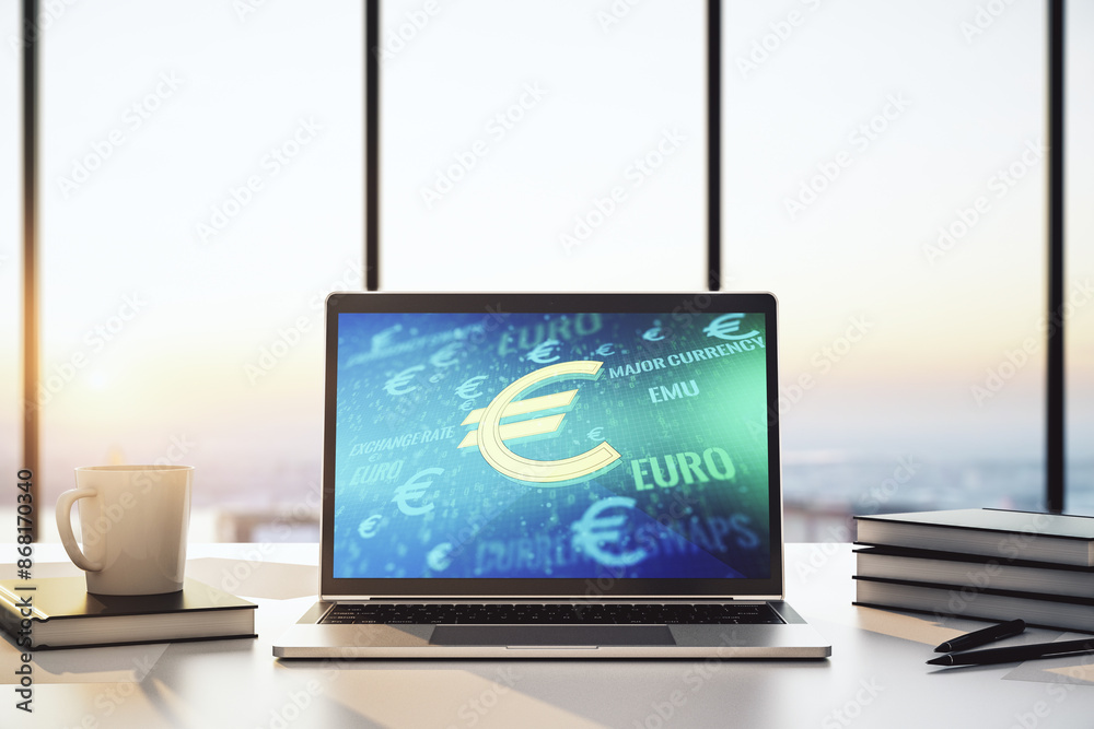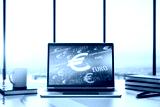 Creative EURO symbols sketch on modern laptop monitor, strategy and forecast concept. 3D Rendering