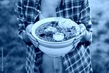 Bowl of water with flowers in woman's hands close-up.