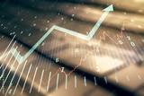 Multi exposure of virtual abstract financial graph and upward arrow on abstract metal background, financial and trading concept