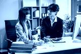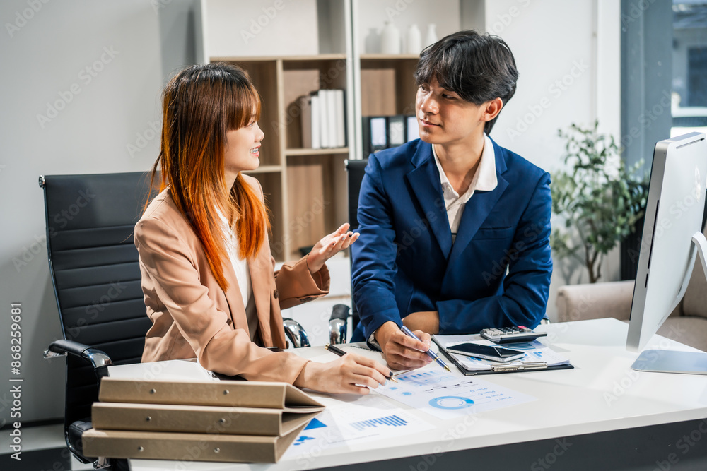 A businessman and businesswoman work late in the office, discussing strategies at a desk. They use technology and teamwork to plan and achieve success, demonstrating effective communication.