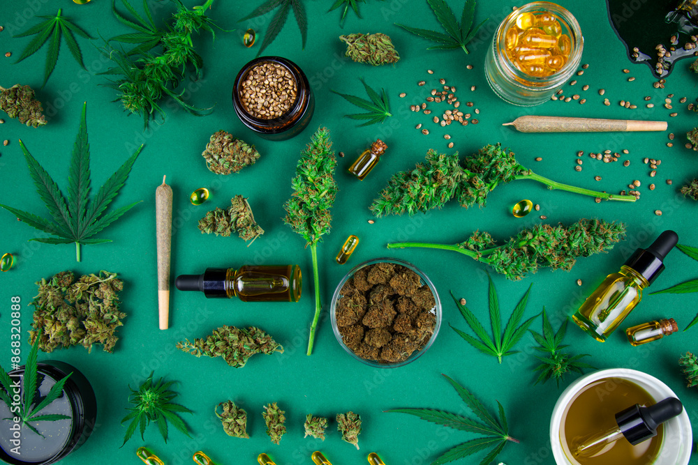 Flat lay, Top view of marijuana leaves and cannabis buds, cbd concept