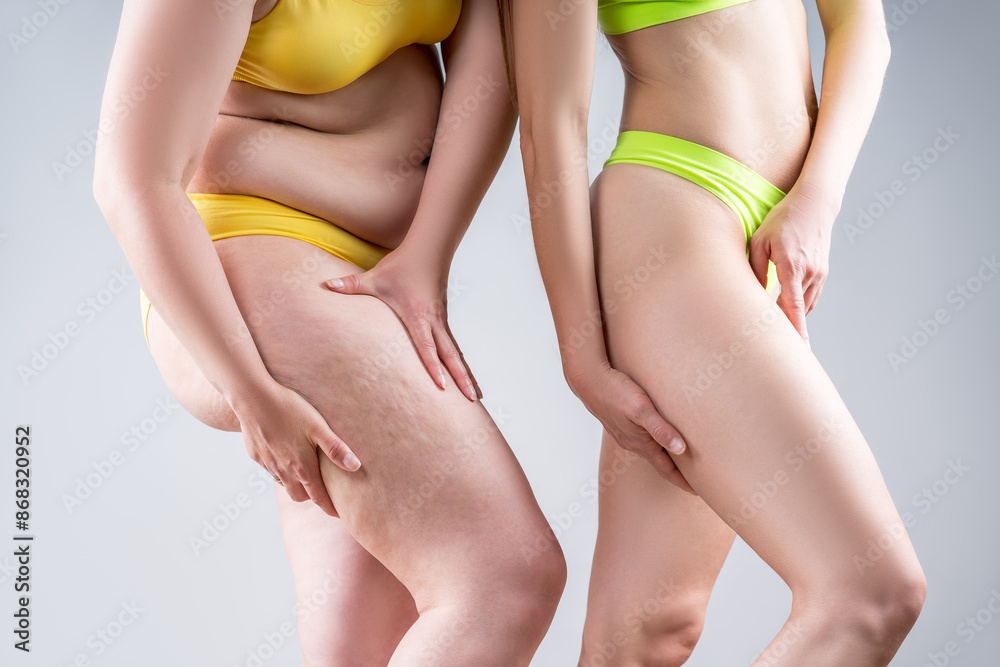 Before after weight loss, two women with fat and thin hips and legs, obesity and muscular female body with cellulite on gray background