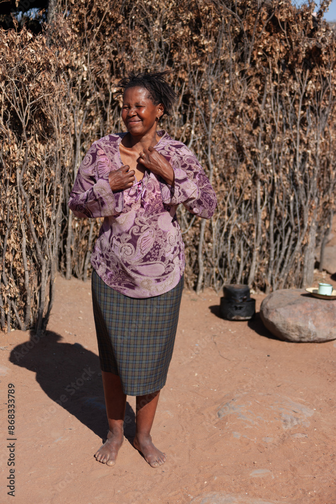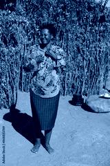 half portrait of old african woman in the village, with braids in front of her outdoors kitchen