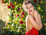 Outdoors portrait of beautiful young brunette girl in luxury red dress posing in summer garden.