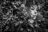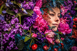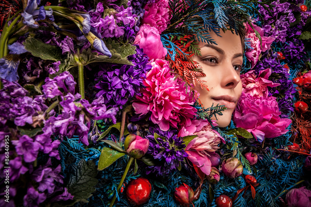 Fairy tale girl portrait surrounded with natural plants and flowers. Art image in bright fantasy stylization.
