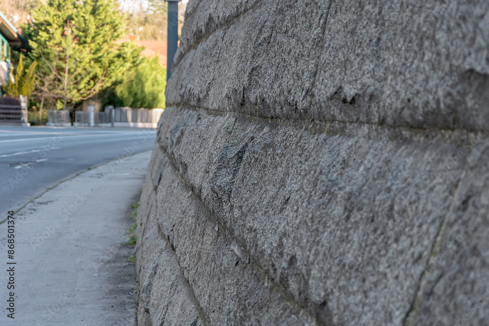 A sloping stone wall along a city street in Austria.