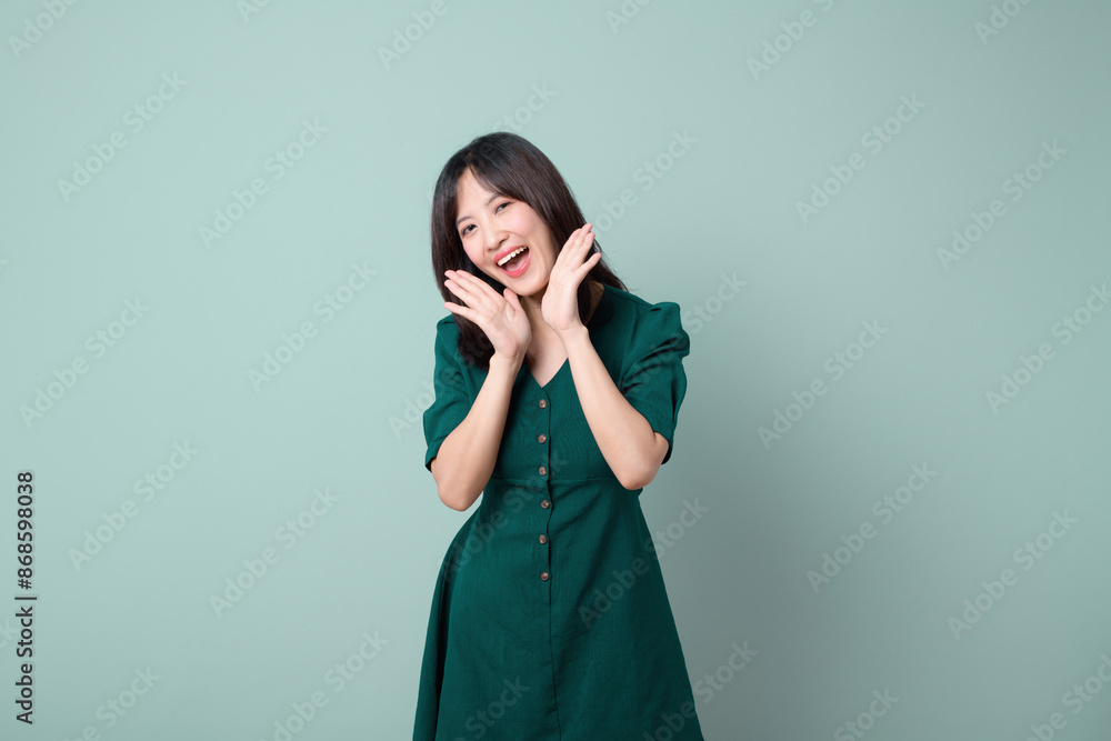 Happy Asian woman shouting above green dress poses against green background blank copy space for advertising content promotion