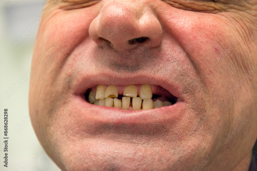 Close-up of a male patient's mouth showing damaged teeth BEFORE dentures. The man is missing some teeth and his teeth are very worn. Real photo from the series. There are before and after photos.