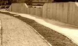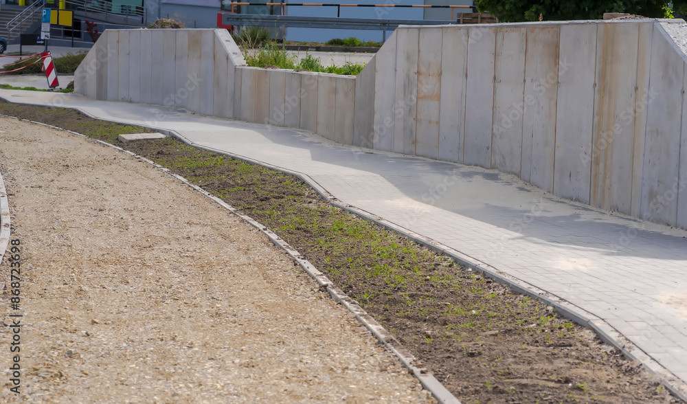 Chodnik z murem oporowym i ścieżką rowerową przygotowaną do asfaltowania. Nowo wybudowana droga w mieście - droga już na ukończeniu.