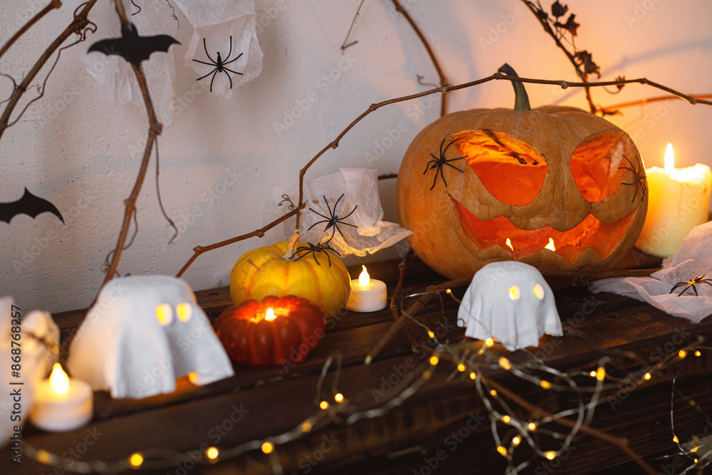 Halloween pumpkin, glowing ghosts, spiders and bats on table. Happy Halloween! Halloween decor with spooky Jack o lantern and candles , space for text. Trick or treat