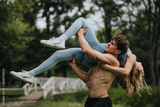 Man walking and carrying his girlfriend in the park, highlighting fitness, strength, romance, and outdoor fun