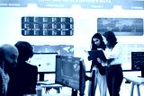 Professional forecast affiliates group work in monitoring room, making crucial decisions together to ensure objectives accomplishment and work on international business expansion.