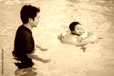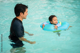 happy father with toddler baby girl playing in an inflatable ring in swimming pool
