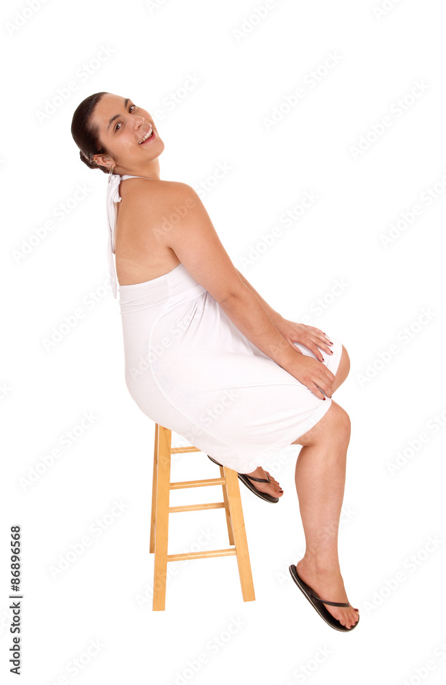 Woman in white dress sitting on chair.