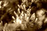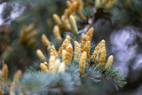Beautiful young yellow pine cone flowers in the branches of tree. Autumn scenery in park.