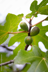 Beautiful fig thee branches with leaves and green fruit. Autumn scenery in park.
