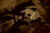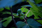 Beautiful fig thee branches with leaves and green fruit. Autumn scenery in park.