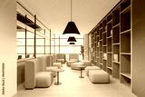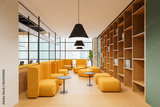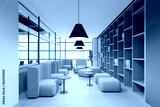Colored office living room interior with soft place, shelf and panoramic window