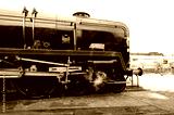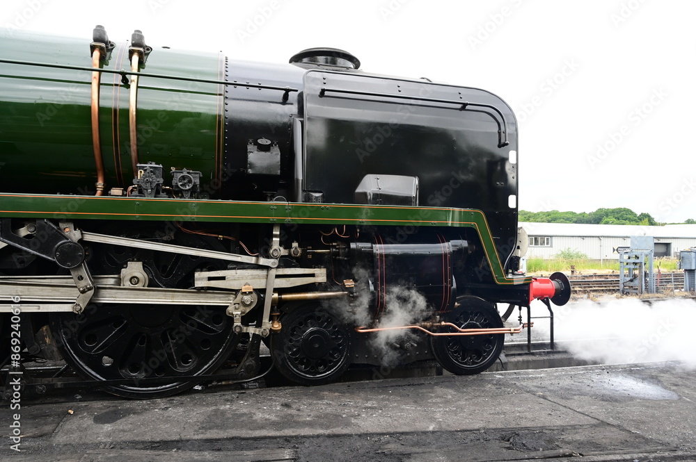 Battle of Britain class locomotive at a railway siding in the UK.