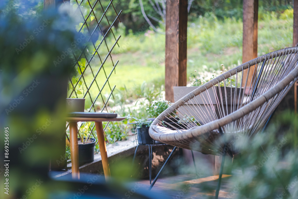 Summer mood, chair chaise lounge on a wooden terrace in a country house