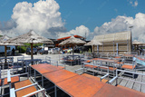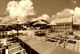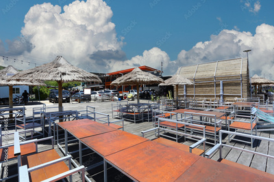 Wooden tables in outdoor grill restaurants with dry grass roofs..