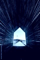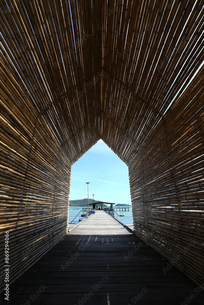 A tunnel made of bamboo sits on a bridge that stretches into the sea.