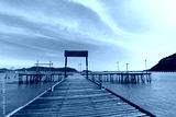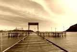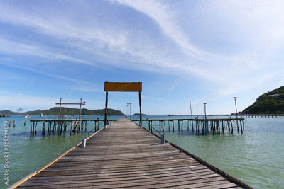 Empty wooden sign on a wooden bridge leading into the sea at a resort on a clear day at Samae San Bay of Chonburi Province in Thailand.