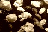 Green light jellyfish are floating in the water with lights shining on them, creating a glow.