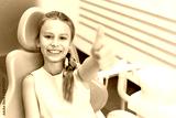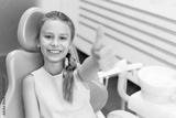Portrait of happy girl shows thumb up gesture at dental clinic