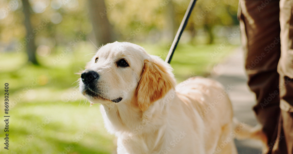 Animal, dog and leash in park for walk, exercise and golden retriever breed for puppy training. Pet, protection and guide for emotional support and love, comfort and cardio in field or nature outside
