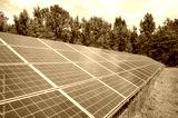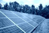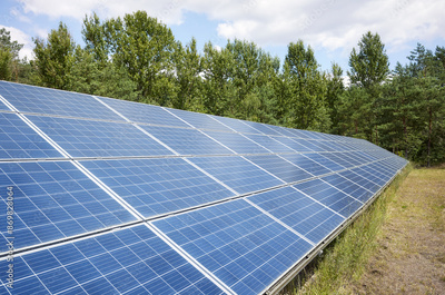 Photo of solar panels in a field, selective focus.