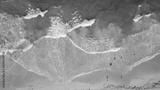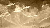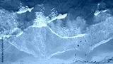 Aerial view of a sandy beach with turquoise waves crashing onto the shore scattered people are seen walking along the coastline