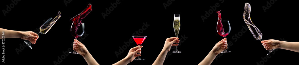 Woman hands holding cocktails, champagne and beer glasses isolated on black.