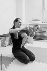Infant neurological examination with arm traction in a physical therapy setting. Therapist examining infant strength, lateral bends and abnormal movement