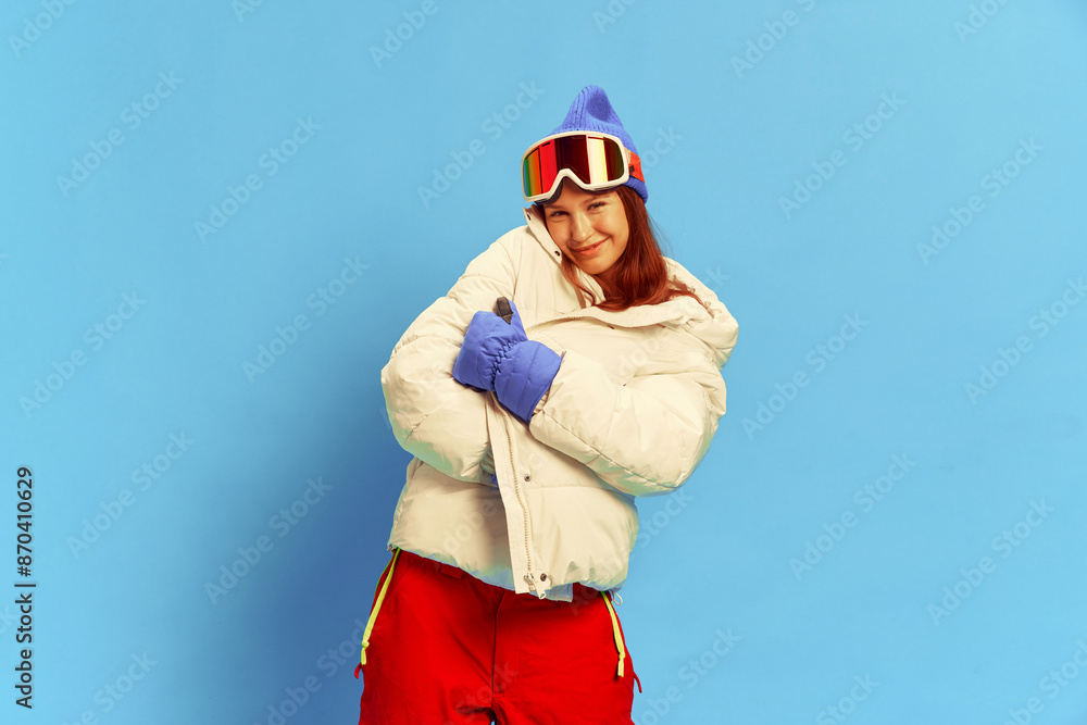 Portrait of happy young girl in goggles, winter clothes padded jacket and pants posing against blue studio background. Concept of winter sports, fashion, youth, human emotions, creativity, vacation