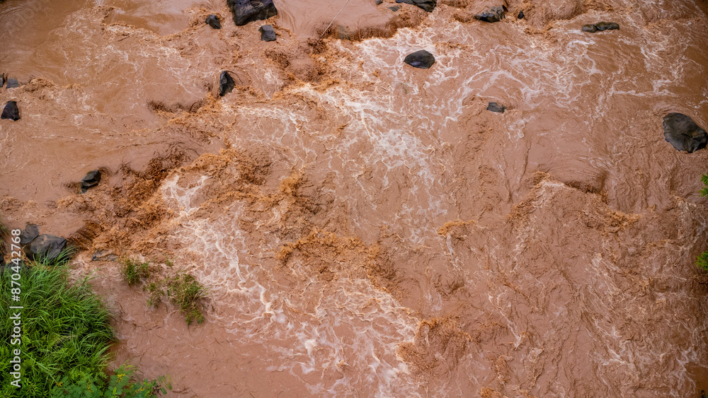 Close-up aerial view of the mighty Mekong River shows its muddy waterways flowing hard and fast during the rainy season.