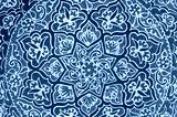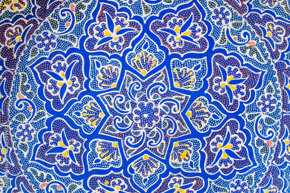 colorful pattern on oriental Uzbek ceramic plates hand-painted close-up in Arabesque style