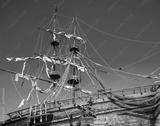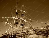 mast with sails on an ancient wooden pirate ship on background of blue sky