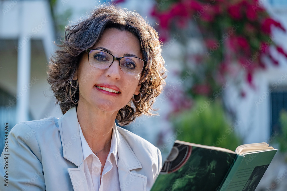 Business woman or young professor sitting in front of office building or university campus and holding a book, looking at the camera.