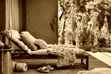 Cozy composition of warm terrace interior with garden armchair, pillows, vase with flowers, bench, green coffee table, slippers, vase with flowers and personal accessories. Home decor. Template.