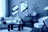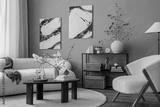 Creative composition of living room interior with mock up poster frame, boucle sofa, wooden coffee table, round carpet, white armchair, magnolia and personal accessories. Home decor. Template.