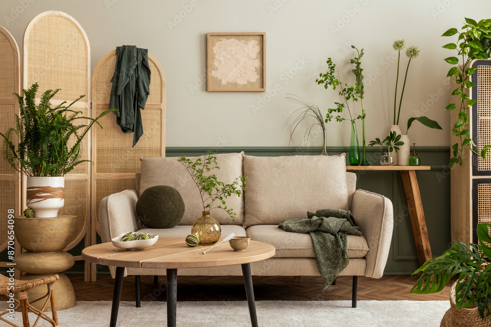 Interior design of spring living room interior with mock up poster frame, beige sofa, wooden coffee table, plants in flowerpots, rattan sideboard and personal accessories. Home decor. Template.
