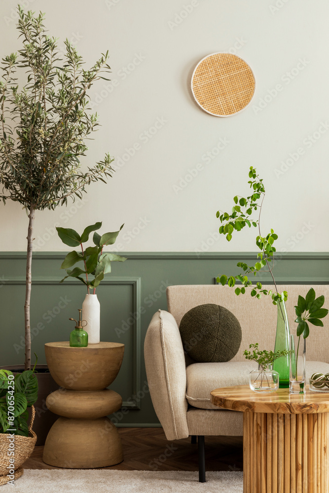 Creative composition of botanic living room interior with beige sofa, carpet, wooden coffee table, plants in flowerpot, vase with leaves and personal accessories. Home decor. Template.