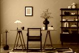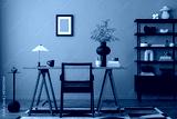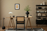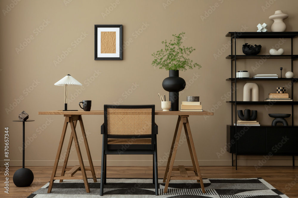 Creative composition of cozy workplace with mock up poster frame, wooden desk, rattan chair, black rack, simple lamp, vase with flowers, patterned carpet and personal accessories. Home decor. Template