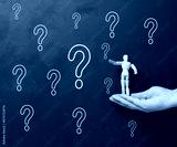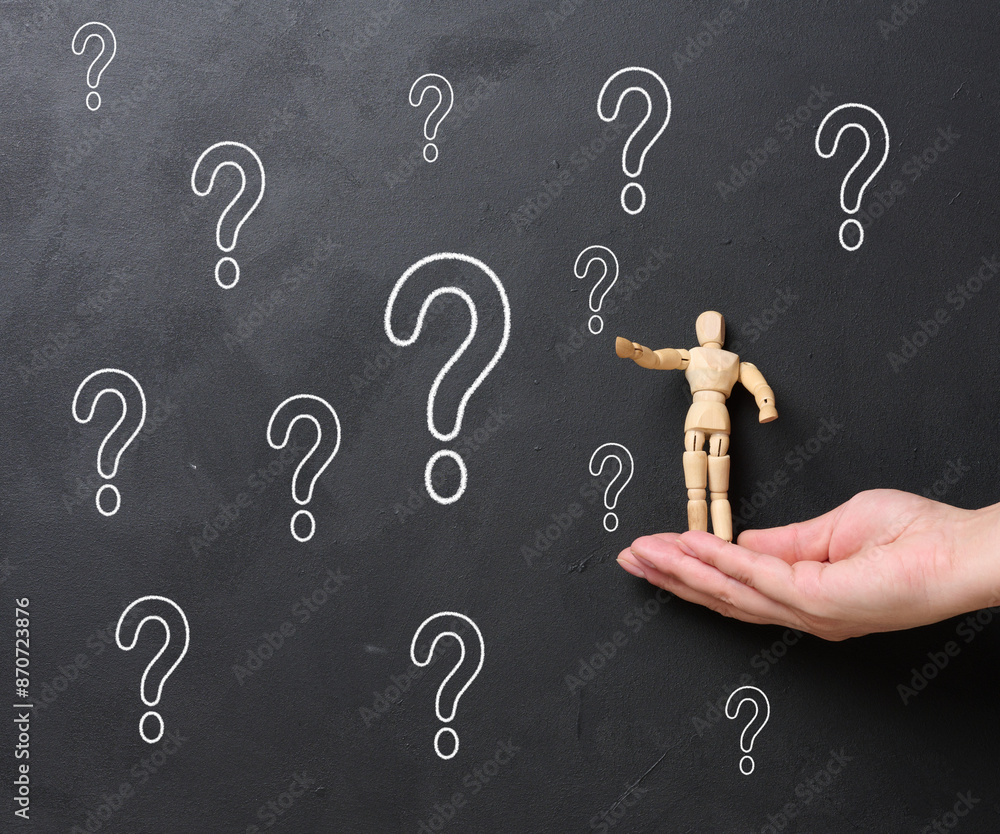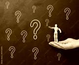 A woman's hand holding a wooden miniature puppet against a black chalkboard with chalk-drawn question marks.